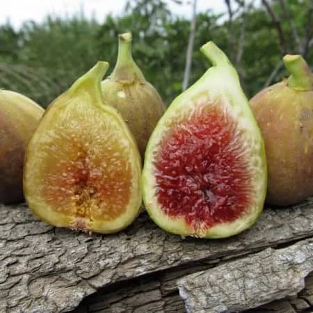 Плоды крупные, достигают массы 55-65 грамм и имеют грушевидную или округлую форму, светло-зеленую окраску и ярко-розовую, сочную и сладкую мякоть. Инжир Кадота морозостойкий – до -32 градусов Цельсия. Урожайность с одного куста составляет около 40 кг. Рекомендуется выращивать на солнечной стороне участка и укрывать на зиму.