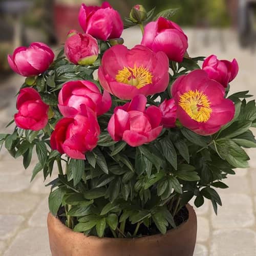 | Горшечный пион травянистый патио Oslo | Особенностью патио пионов Oslo является желтое дно в бутонах цветка, окруженное бархатными лепестками, что придает растению особую грацию и привлекательность. Эти цветы являются низкорослыми и подходят как для высадки в грунт, так и для выращивания в горшках. | |