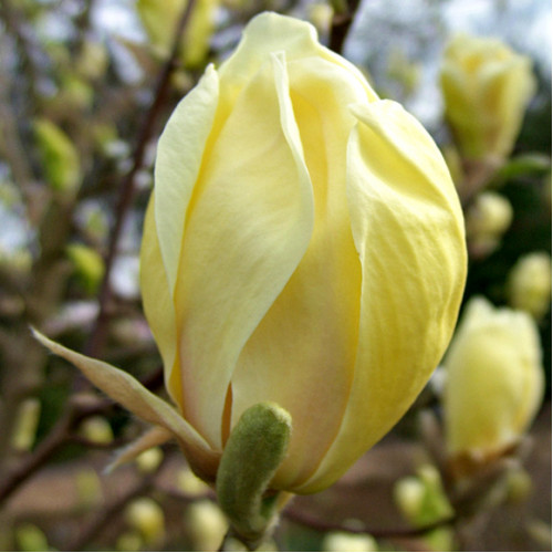 Magnolia ‘Yellow Lantern’ — великолепная магнолия с редкой среди магнолий жёлтой окраской: крупные тюльпановидные цветы нежно-лимонного оттенка распускаются весной, создавая яркий и ароматный акцент. Крона растения изначально колонновидная, постепенно расширяется до овальной формы, высота взрослого дерева достигает 8-10 м, ширина примерно такая же.