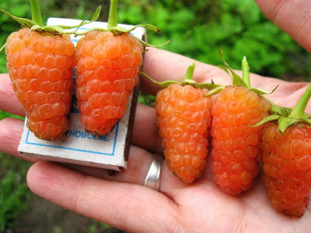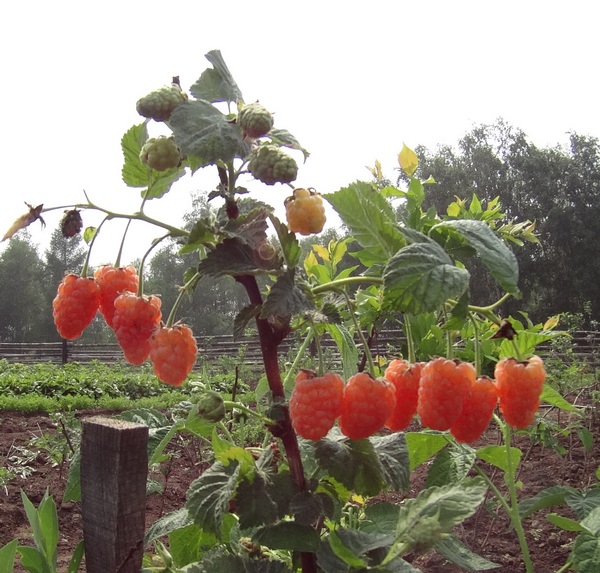 Сорт малины ремонтантный, универсального назначения, самоплодный. Ягода округло-конической формы, с мелкой костянкой, сочная, желто-золотистая, яркая, с ощутимым ароматом, десертного вкуса. Средняя масса 3,6-3,8 г. Срок созревания - начало-середина августа, плодоношение до заморозка. Шипы короткие, мягкие, средне сильный, не слишком раскидистый. Однолетние побеги светло-зеленые, имеют восковой налет. Высота куста - невысокий, до 1.4-1.5 м.